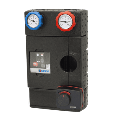 GRF121 regleras av ESBE ARA661 (230V, 90° arbetsområde, 120 s. gångtid), ett ställdon med 3-punktssignal (öppna/stäng) som är perfekt för blandning tillsammans med en extern reglering. Det kompakta ställdonet har 90° arbetsområde och ventilen kan enkelt handmanövreras med hjälp av drag-och-vrid-ratten på framsidan. ESBE shuntgrupp GRF100 är driftklar för 180 mm pumpar. Det smarta justerbara isolerskalet säkerställer att alla pumptyper isoleras på rätt sätt.