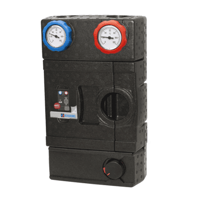 GRF111 levereras med 3-vägs vridande progressiv shuntventil som säkerställer låg risk för överdimensionering och bästa möjliga reglerprestanda oberoende av flödeshastigheten. ESBE shuntgrupp GRF100 är driftklar för 180 mm pumpar. Det smarta justerbara isolerskalet säkerställer att alla pumptyper isoleras på rätt sätt.