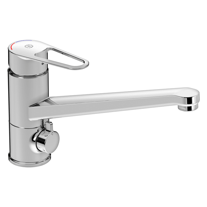Greppvänlig spak med tydlig färgmarkering för varm- och kallvatten