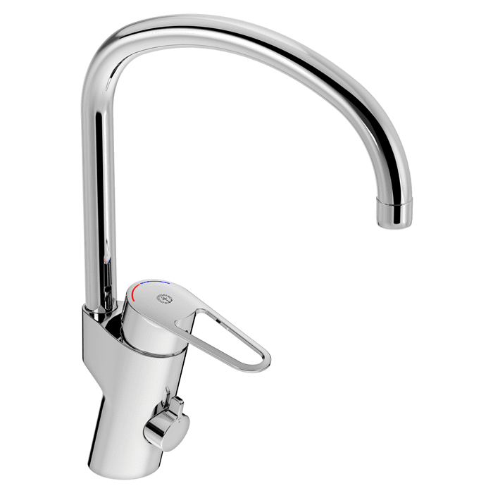 Greppvänlig spak med tydlig färgmarkering för varm- och kallvatten