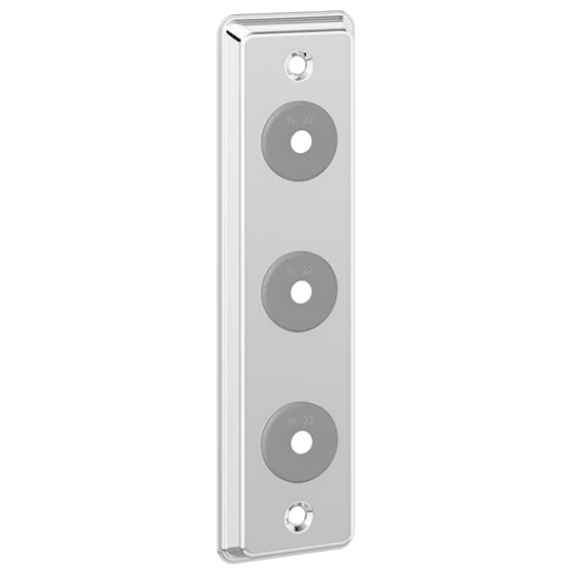Stabil rostfri, blankpolerad täckbricka för tre rör. Med gummitätning för att hindra att fukt tränger in i vägg. För rörtyp Ø10-22 mm. Skruvhål 180cc. Mått:60×220 mm.