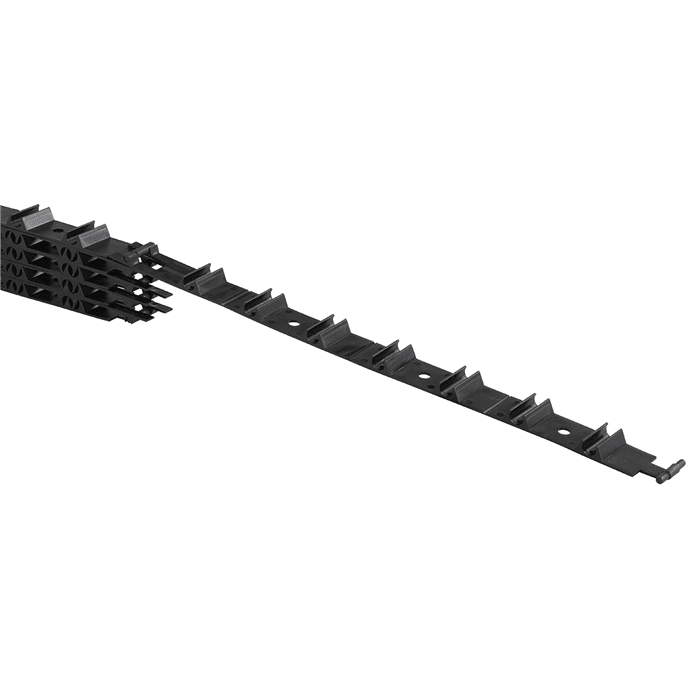 Rörhållarskena med hål avsedd för ingjutning av 12 mm golvvärmerör. Skenan skruvas fast i underlaget och ger en stabil och exakt förläggning av golvvärmesystemet.