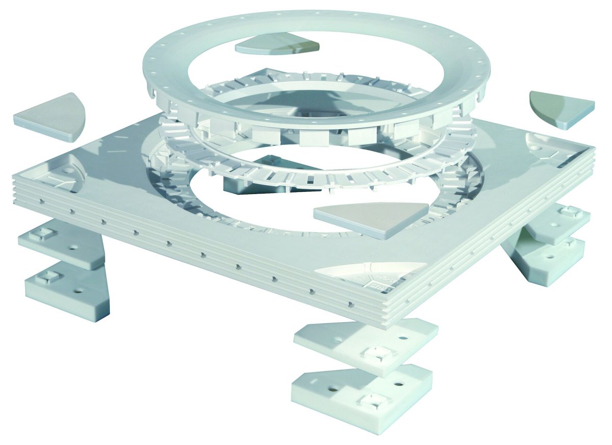 Monteringsplatta 300 Multi i plast används tillsammans med Purus golvbrunnar i plast och rostfritt vid installation i träbjälklag. Monteringsplattan har inbyggt fall och är 22 mm tjock i kanterna men kan monteras med distansklotsarna i 6 resp 13 mm för att öka höjden. De två klotsarna kan kombineras till 19 mm. För plastmatta som ytskikt används ingen klots och för klinkergolv ska minst 13 mm klotsarna användas Monteringsplattan är tillverkad i ABS plast som är limbar.