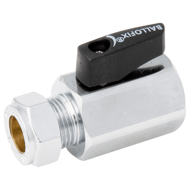 Ballofix® 505 Rak kulventil 10xR15, med klämring x invändig gänga förkromad med vred