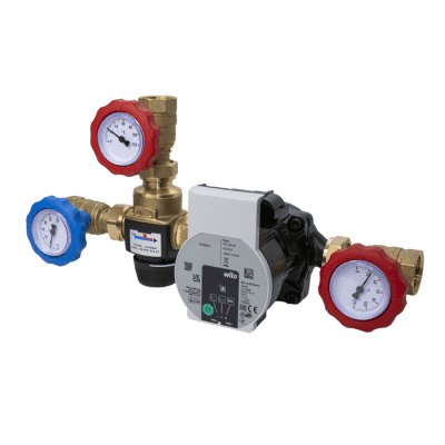 SFK100 är en laddgrupp avsedd för att skydda fastbränslepannor mot för låga returtemperaturer. Gruppen finns med termostatisk lösning, motoriserat styrdon eller konstant temperaturreglering.