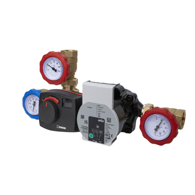 SFK100 är en laddgrupp avsedd för att skydda fastbränslepannor mot för låga returtemperaturer. Gruppen finns med termostatisk lösning, motoriserat styrdon eller konstant temperaturreglering.