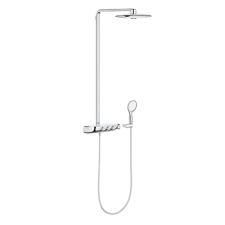 Rainshower System SmartControl 360 DUO duschsystem med termostat för väggmontage. Duschsystemet består av en horisontell duscharm (500 mm), en termostatblandare, huvuddusch Rainshower XXL, handdusch Power&Soul 115 och duschslang Silverflex 1750 mm. Både hand- och huvudduschen erbjuder två strålmönster och är försedda med GROHE DreamSpray. Termostatblandaren är försedd med en GROHE TurboStat kompakt insats med keramisk kropp som är vaxbaserad. en kromad GROHE StarLight-ytbehandling, GROHE CoolTouch samt GROHE SafeStop vid 38° C. GROHE EcoJoy hjälper till med vattenbesparingar på upp till 50 %, medan SpeedClean antikalksystem och Inre Vatten Guide förenklar rengöringen och ger duschsystemet en längre livstid. GROHE EasyReach duschhylla ingår och duschslangen är Twistfree, vilket förhindrar att den snor sig.
