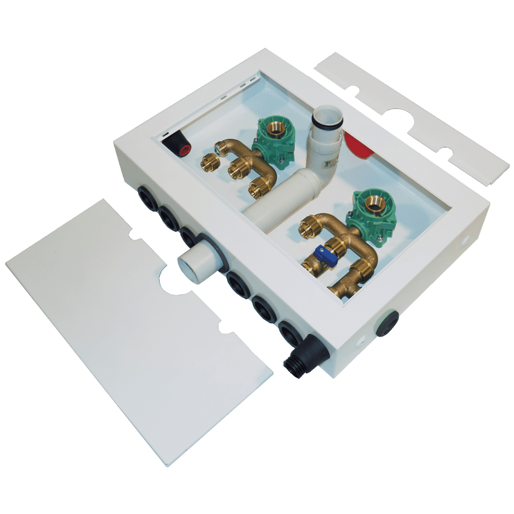 Fördelarskåp vitlackad aluminium för vattenfördelning med 2 x 3 uttag. Med färdigmonterade rörgenomföringar, väggboxar och läckut. Väggboxarna i dim 16 x 1/2". Lämplig för montage i badrum under handfat/kommod.